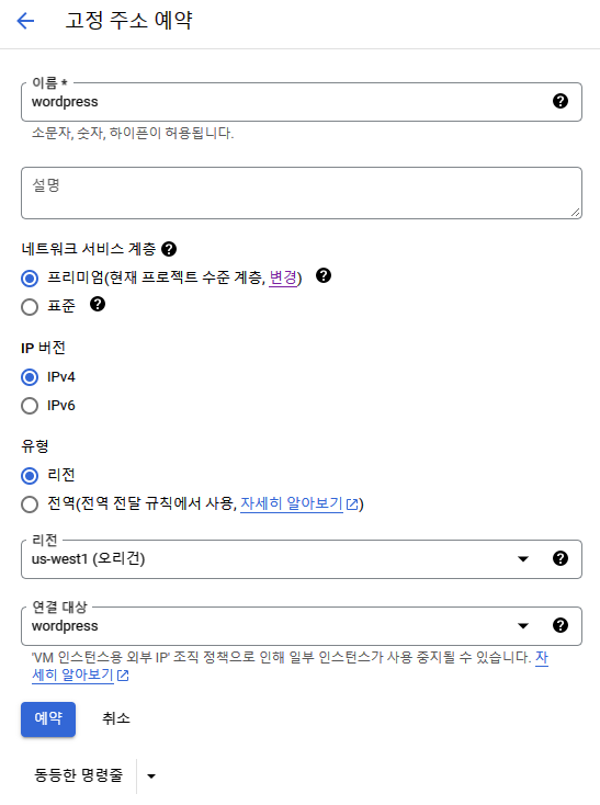 4. 고정 IP 생성 https://console.cloud.google.com/networking/addresses/add?hl=ko