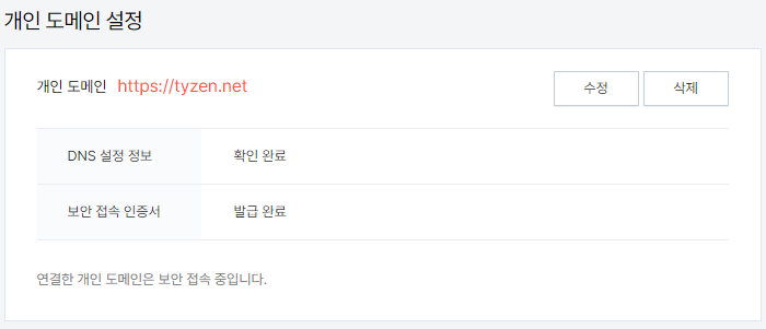 개인도메인 tyzen.net 으로 설정한 경우