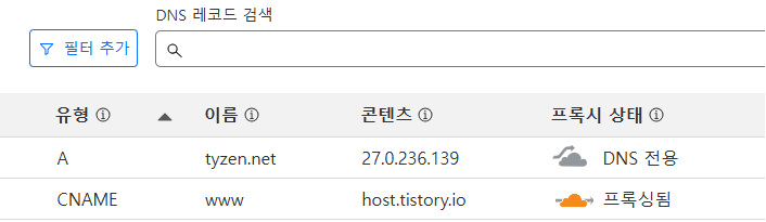 루트 도메인을 CNAME으로 할 경우 클라우드 플레어에서 느낌표와 세모로 작은 경고문이 뜹니다. 일년정도 사용한 결과 연결에 아무런 문제가 없습니다. 해외 웹호스팅을 이용하다보면 자연스럽게 알게 되는데, 루트도메인은 무조건 IP주소로 연결을 하도록 되어 있습니다. 그래서 보다 더 안전하고 정확히 하기 위해서는 루트 도메인은 A 타입 ip주소 그리고 www는 CNAME을 사용해야 합니다. 티스토리의 IP주소가 바뀌면 또 변경해야 하는 번거러움은 있습니다.
